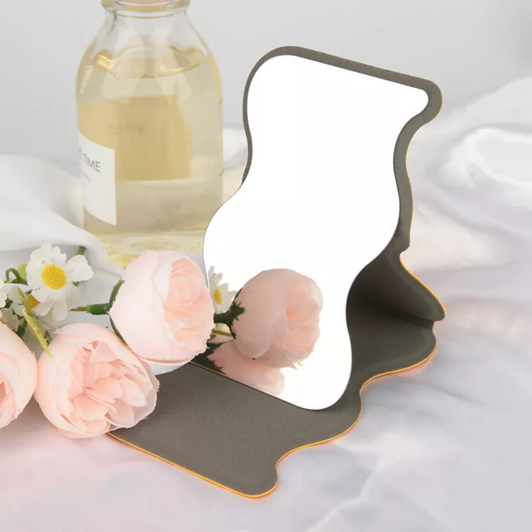 Privlačna zasnova z valovitimi robovi izstopa od običajnih ogledal, vaši lepotni rutini doda eleganten, igriv pridih in postane popoln okras za kozmetične ali potovalne torbe.